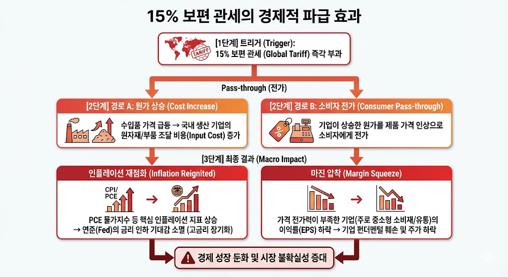 15% 보편 관세 부과는 현재 시장이 안고 있는 매크로적 결함을 극대화합니다. 지난주 발표된 12월 근원(Core) PCE는 이미 전월 대비 0.4%, 전년 대비 3.0% 상승하며 인플레이션 재점화 신호를 명확히 보냈습니다.
