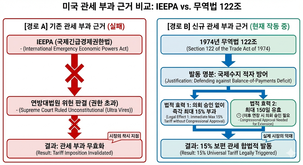 금요일의 지수 상승은 IEEPA(국제긴급경제권한법)에 제동을 건 대법원 판결을 맹목적으로 추종한 숏커버링에 불과합니다. 트럼프 행정부는 판결 직후 즉각 1974년 무역법 122조(Section 122)를 발동하여 최대 15%의 보편 관세를 부과하겠다고 발표했습니다.