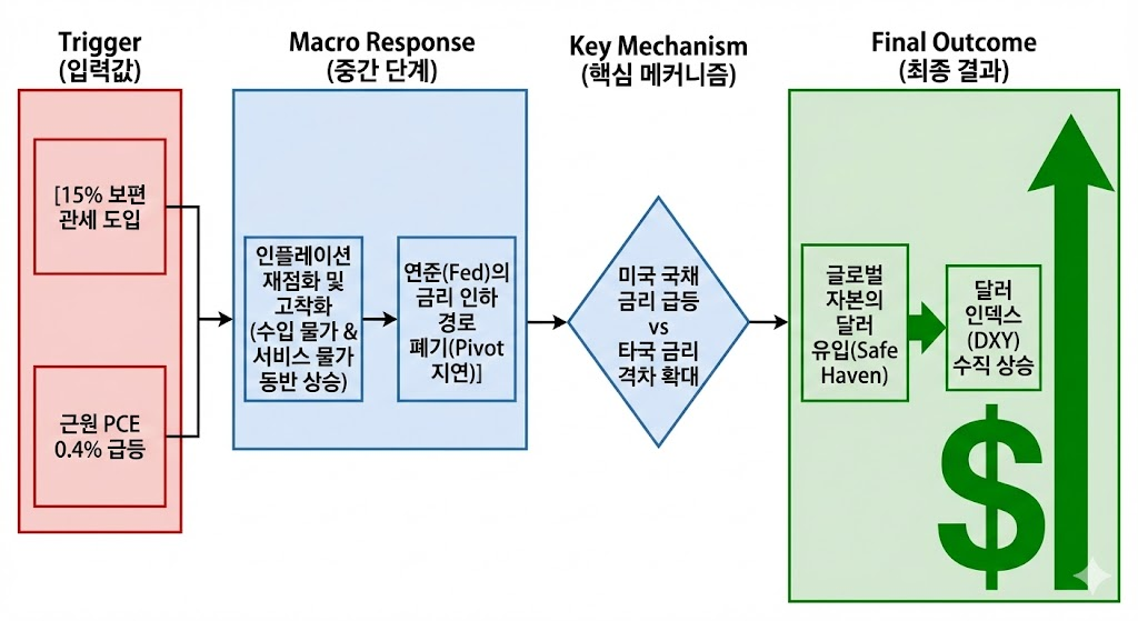 15% 관세와 PCE 상승이 연준 금리 경로를 어떻게 변화시키고 달러 강세를 유발하는지 보여주는 매크로 흐름도